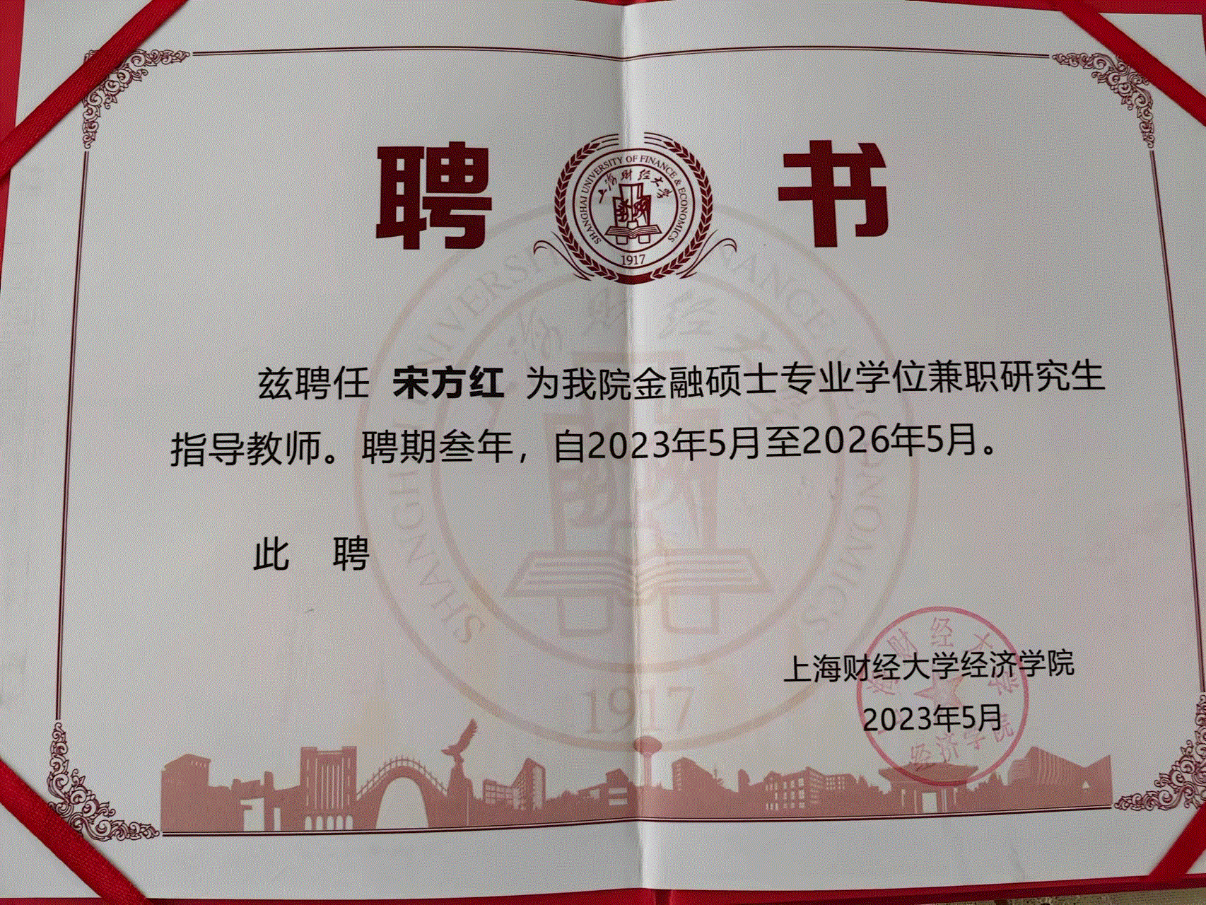 2023年5月20日,上海财经大学经济学院举行研究生兼职导师聘任仪式暨新聘导师交流会,公司总裁宋方红先生连续三届被受聘为上海财经大学经济学院金融硕士专业学位兼研究生指导教师。